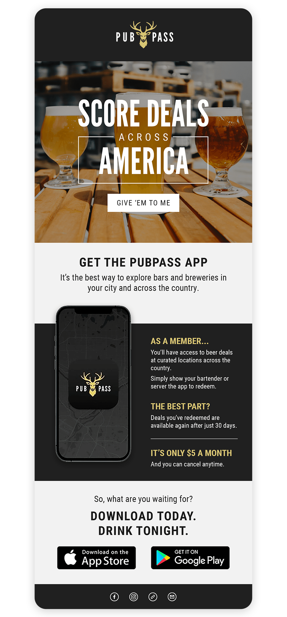 The minimal PubPass® brand called for a limited color palette. Backgrounds are shaded a light grey to keep dark text easy on the eyes, with an accent color that screams, “Beer!” Type was kept simple as well, relying on Roboto Condensed throughout, knowing that most email clients will display a default sans-serif instead.